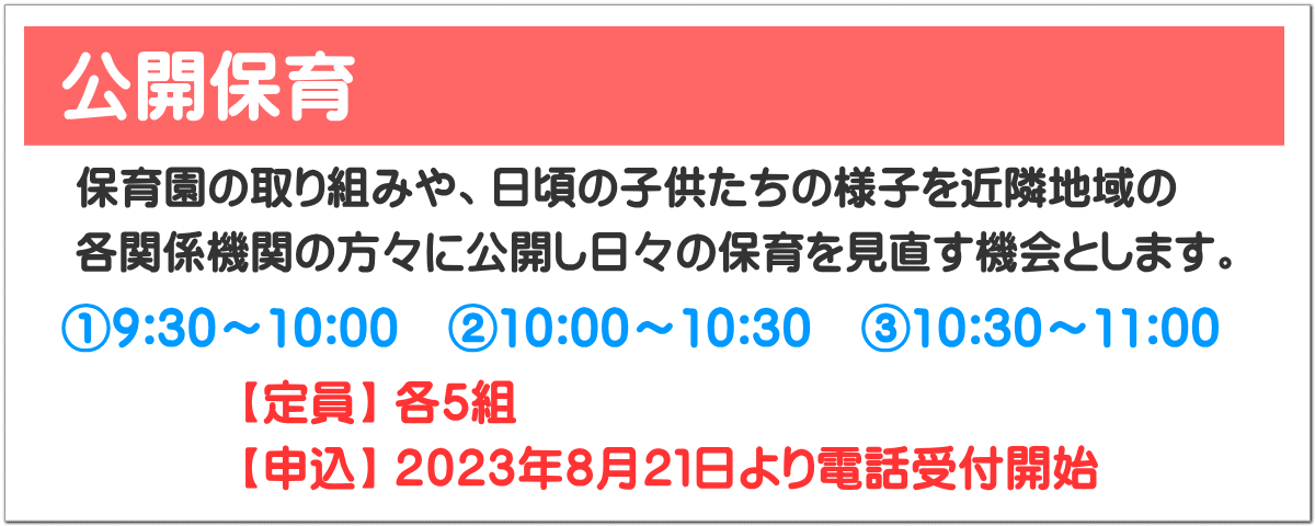 保育園の取り組みや、日頃の子どもたちの様子を近隣地域の各関係機関の方々に公開し日々の保育を見直す機会とします。2025年9月25日(木)