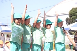 準備体操〈♪かっぱなにさま?かっぱさま!〉で元気いっぱい体を動かし、